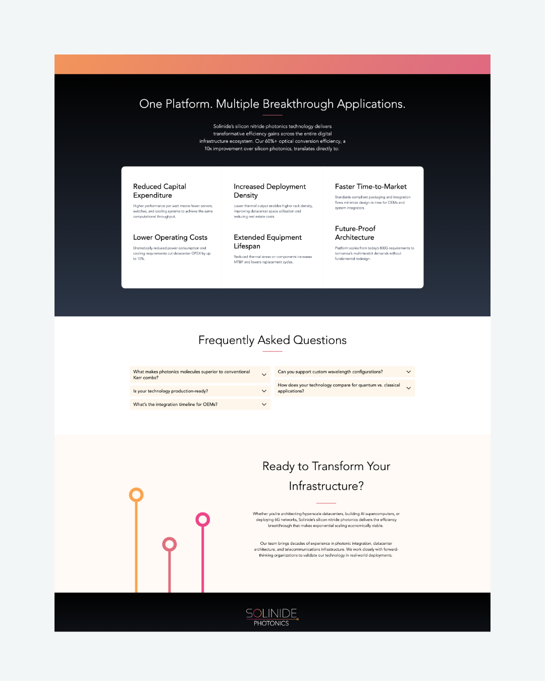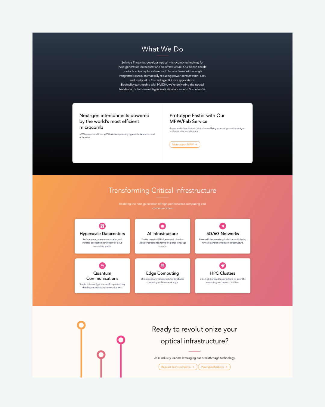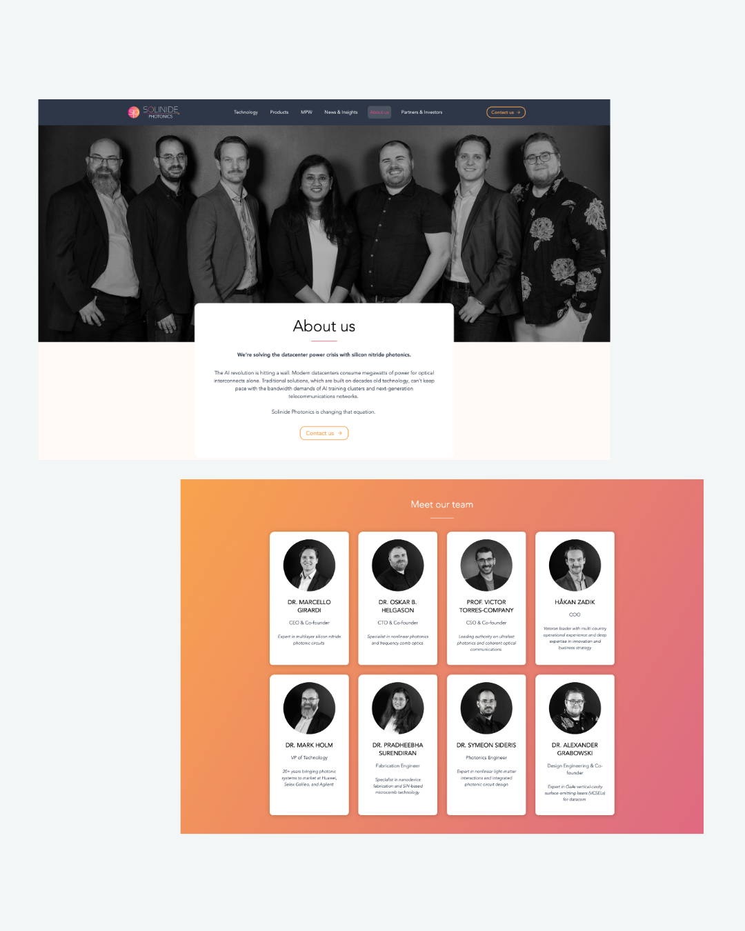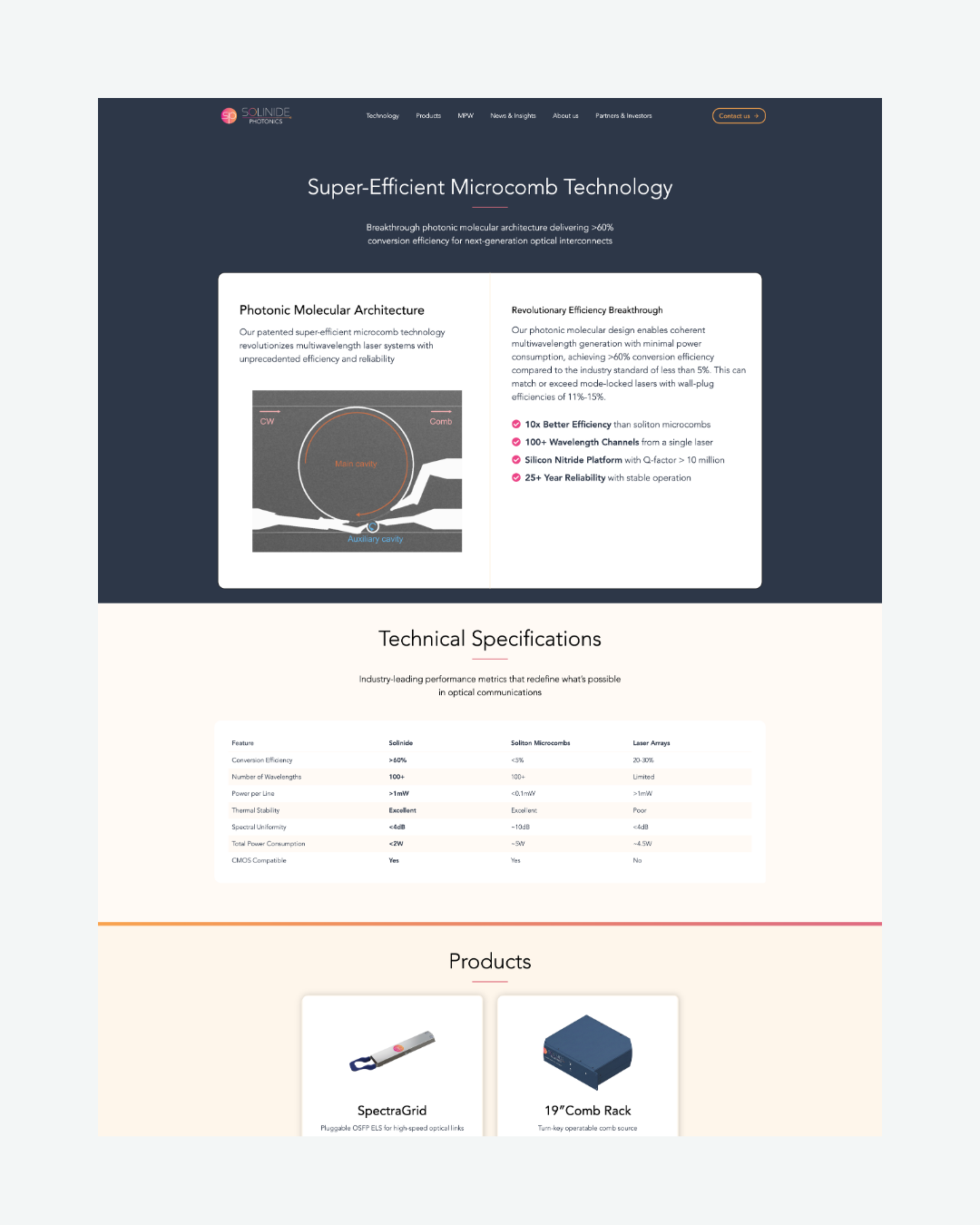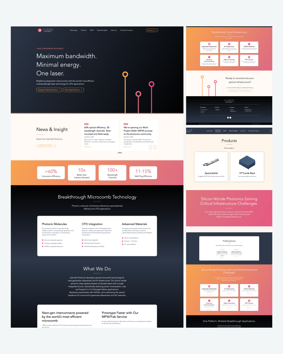 Resultatet är en webbplats som inte bara presenterar innehåll, utan som också förstärker varumärkets tekniska precision och visuella identitet – och gör det enkelt för besökaren att förstå vad Solinide Photonics erbjuder.