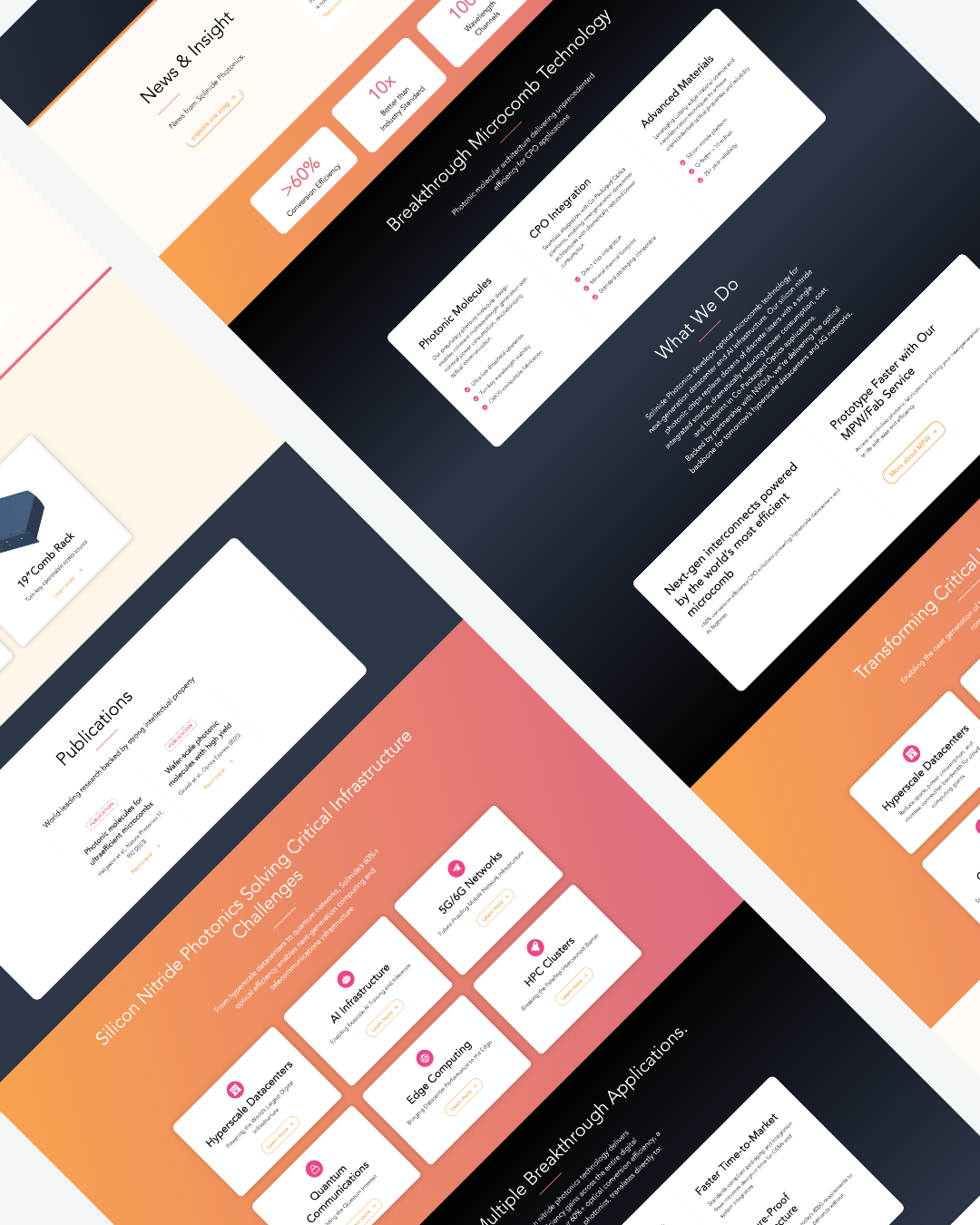 Webbplatsen är där allt knyts ihop. Här omsätts både den visuella identiteten och strategin i en konkret, användbar lösning. Designen bygger vidare på den spektrala gradienten från gul till cerise, där mörka partier skapar djup och kontrast, och ljusa, neutrala bakgrunder ger balans och tydlighet. Återkommande grafiska element – linjer som avslutas i cirklar – förstärker kopplingen till ljusets rörelse och skapar ett konsekvent visuellt språk genom hela webbplatsen.